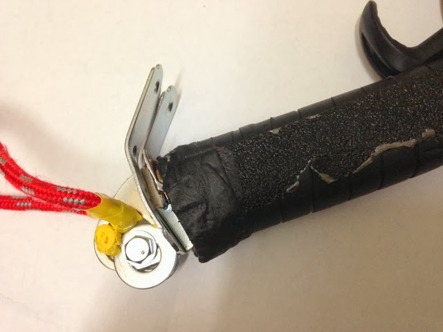 応急処置のつもりで、ホームセンターで適当な金具を探して試行錯誤したらうまく修復できてしまいました。修理に出そうかと思っていましたがこれでいいかな、愛着も倍増したし。あとは粘着性テープを巻きつければ完了です。材料費は300円程度。