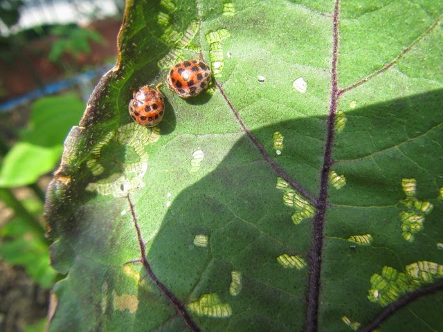 まだ五月なのに、もうナスの苗でニジュウヤホシテントウが葉を一生懸命食べて、卵まで産み付けていました。コイツら大食漢で、ナスが枯れそうになるまで食べ続けます。昨年それで、植えたナスが全滅になるかと思いました。常に葉の状態を注意して虫に食われている場合は葉の裏など要調査ですね。原因がわからないければ夜行性が多いので夜中にヘッドライトでチェックです。