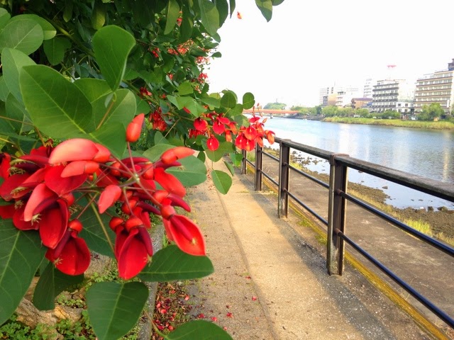 調べると、この川は、いろいろな花が咲くことで有名みたいです。今日見かけたのは赤い花、この花の名前は何というのでしょうか。調べても見つかりません。とってもこの花の名前が気になる1日になりそうです。