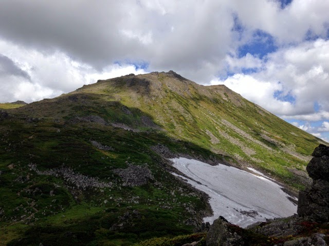 トムラウシ、形のいい山ですね。まだ雪渓が残っています。