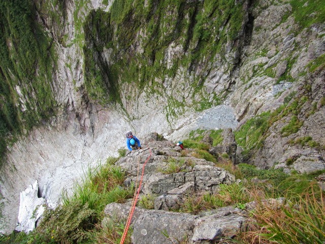 アプローチとなるテールリッジ、噂には聞いていましたがツルツルでほんと悪かったです。特に今回は下山時に雨で濡れましたから、いつ滑ってもおかしくない状態でした。残置ロープが古くなっているものや無くなっている場所がいくつかあったので、次回ここに来るときは古いロープを持ってきて危ない箇所を修復しようと思ってます。