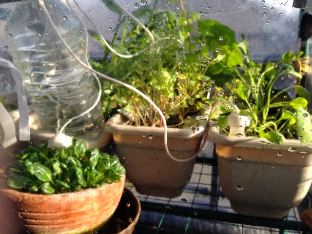 冬越し中の野菜。芽キャベツは外に出しいたら鳥に食べられて、ビニルハウスの中ではアブラムシが大量に発生して、なかなか元気になりません。鳥に見つからないように外に出してアブラムシ駆除します。