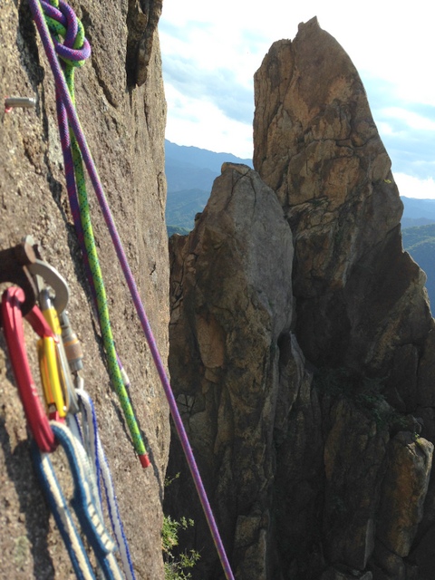 今回はこの岩場で人気の代表的ルート、ニードル左岩稜のニードルから懸垂下降して、サマーホリデーを継続。写真はニードル基部。