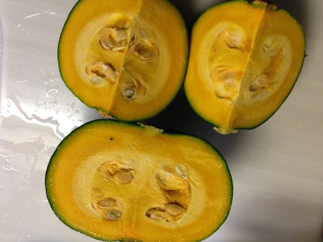 カボチャ堅くて切るのがたいへん、中身がちゃんと黄色になっているかちょっと不安でしたが、大丈夫でした。
