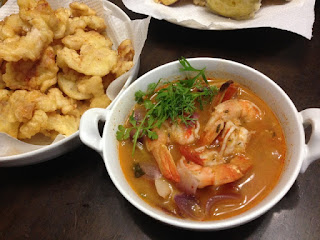 この日、大分帰りのわたしは金曜日に目の前で美味しそうに食べていたとり天が食べたくて、とり天も(これも自分で作っていません)。ポン酢にゆず胡椒を入れて食べるととっても美味しいです。わたしはこぶみかんの若葉が茂ってきて少々間引いたのでいつものトムヤムクン。料理、ばらばらです。
