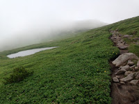 木道の後、化雲岳を目指して登りますが、ポン沼(写真左)過ぎてからやたら遠く感じて、ガスも濃かったのでルートを間違いたのではないかとかなり不安になりました。時間も遅いので禁じ手のスマホのGPSで自分の位置が確認、まだ化雲岳は通過していなくて、ガスの中にうっすら見えたピークが化雲岳でした(写真右)。初日の最高地点の化雲岳に到着です。スタートが遅かったこともあり、ここで18時となっていました。