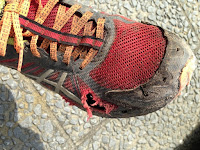 今回のトレラン、ほとんど新品だったトレランシューズの小指部分が大きく破れてしまいました。ロングトレイルするとここが必ず破れてしまいます。破れると小指がいろいろな障害物に直接当たるので小指は腫れ上がり、爪は完全にいかれます。つま先部分をもっとしっかりプロテクトしている軽いトレランシューズはないのでしょうか。次のロングトレイルは少々重くても替えます。