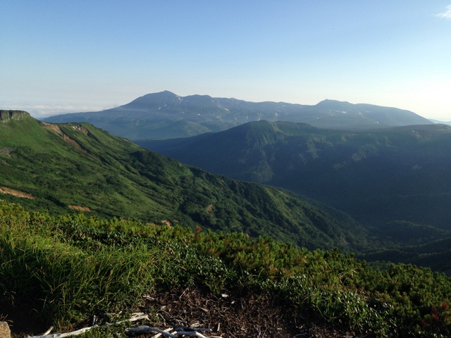 本来なら夜中に起きてヘッドライト行動を数時間するのですが、今回はそのモチベーションは起こらず、明るくなってから起きて5時に出発しました。まずは再び化雲岳を登ります。振り返ると昨年登ったトムラウシが見えます。