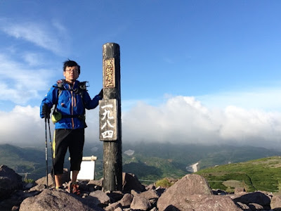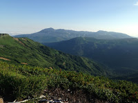 黒岳頂上は、わたしが登った時間はラッキーなことに誰もいませんでした。山の稜線はガスがかかっていますが、空がとっても青いです。これで今回のロングトレイルは終了、30分ほどその場にいて後はさっさと下りるだけです。
