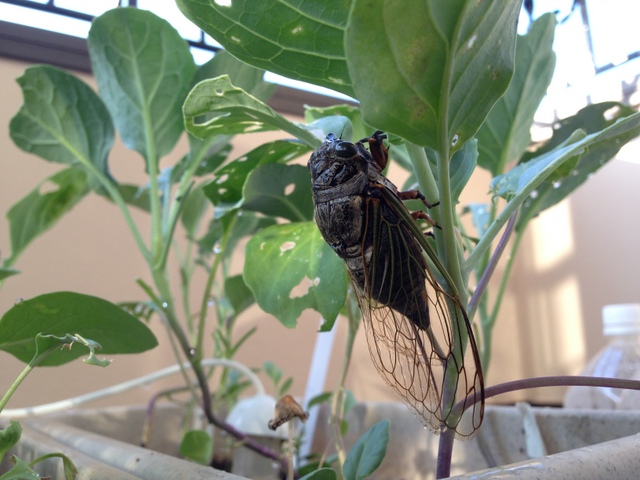 タイ野菜のカナー、ベランダで育てていてもアオムシにやられてなかなか食べれる状態になりません。今朝アオムシのチェックしようとしたら、なんとクマゼミが。