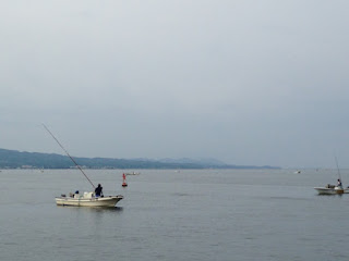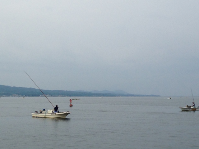 曇りなんですがとっても素敵な景色をみました。 何度も来ている松江ですが、はじめて宍道湖のしじみ漁をしている風景に出会いました。宍道湖ですねえ。 あとで地元の人に聞いたら宍道湖のしじみは完全な天然で、週三日程度の漁で漁獲高も制限されているそうです。これまでずっとタイミングがあっていなかったようです。今回は慌ただしい滞在だったので、しじみを食べられなかったのがとても残念。