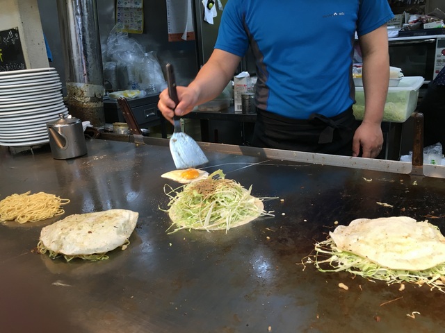 広島駅の近くに遅くまでやっていて混雑しているお好み焼き屋を見つけました。ここおいしいです。