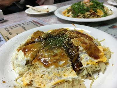広島焼き→想夫恋の焼そばというソース味の粉モノとなります。このお好み焼きと焼きそばは癖になります。ほんとおいしい。ソース味の大好きなわたしにはたまりません。減量中ですがこの二食は仕方ありません。
