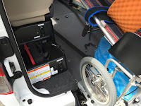 セレナ(2000CC)より、車が小さいなのストレッチャーがちょうど入るスペースでぎりぎりです。真ん中の席は補助席、後ろも狭い据え付けの椅子でストレッチャーを使わないときに椅子を出すことはできません。オレンジ色の目立つ手摺りが何カ所もついていて便利なんですが、逆に邪魔になったりもしそう。ただ、これは取り外しは可能だそうです。またオレンジ色は目立っていいのですが、どうしても業務用の車ってイメージになってしまいます。