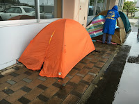 最初は雨が多少は防げる軒下にテントを張りましたが、夕方晴れてきたのでいつもの芝生の上に移動。この天気と寒さにまだ走るモチベーションが起こりません。