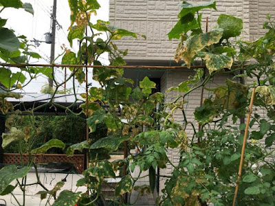 梅雨の時期は、うどんこ病あるいは炭そ病にすぐになるんですよね。特にウリ系の野菜は。禁断の薬を使ってもなかなか治らないですね。症状が出てきたら葉を刈り取りそれを処分するしかないような。でも葉がなくなっちゃうんですよね。キュウリのこの株は花も咲かなくなってきたので刈り取って新しい株に変えます。でも連作するとまた同じ病気になるのかなあ。まあ梅雨が明ければ大丈夫でしょう。