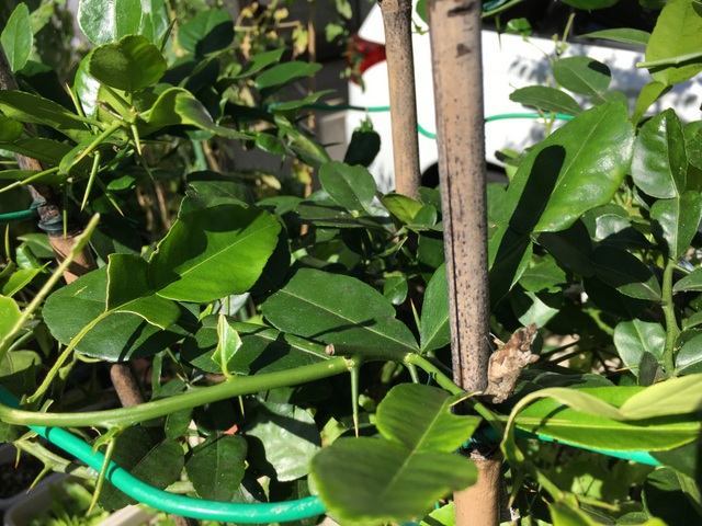 大切に育てているタイ料理用のコブみかんの木ですが、アゲハの大好物みたいで、少しだけ幼虫が食べるの許してました。支柱に蛹が二つほど見つかりました。これって越冬するんですか、それとももう一度成虫になるのでしょうか。後者だと冬支度するときにかなり気を使わないといけませんね。