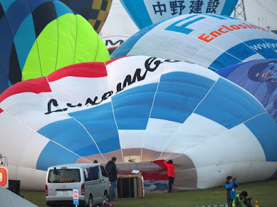 合図があると一斉に広げた気球に風を送り始め、ある程度膨らむとバーナーの火がついて気球が立ち上がってきます。