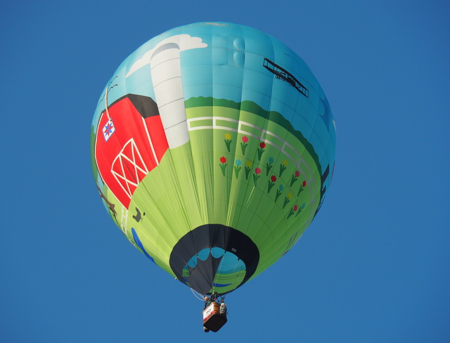 すべての気球が離陸すると別のところから離陸した気球が会場に向かって飛んできました。ここから目の前で競技です。競技にはいくつもの種類があるのですが、今回は制限時間内に地上のマークした地点にリボンのついた砂袋を落とします(マーカーと呼ぶようです)。写真はちょうど×点の真ん中にマーカーが落ちていくところです。気球はバーナーで上下しかコントロールできないのであとは風頼み。これはすごいです。
