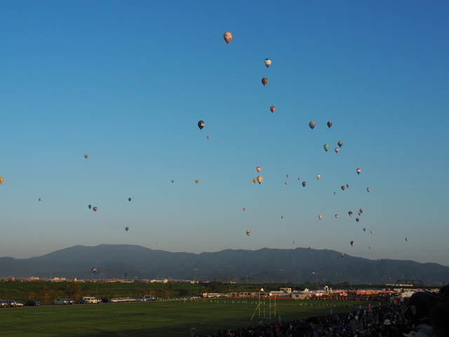 中村あゆみのライブの後は、夕方の一斉離陸がありました。夕日に照らされながら空に飛んでいく気球は美しいです。