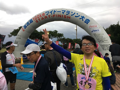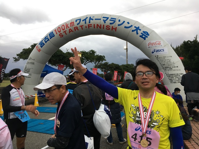 右の写真はいっしょに走った友人です、ゴール閉鎖3分ほどまにゴールでした。この方、毎回はらはらされるのですが、今回は前半折り返しで会っているんですがなかなか早かったのですが、後半寒さでかなり消耗しましたね。日本一長い農道の橋です。はれだったら透明度の高い海が眼下にみれてとっても綺麗なんですけどね