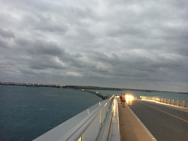 40KM地点にある池間大橋、ここは伊良部大橋と比べると多少短いのですが、天気がいいと真っ青の中を走れるのですが。わたしは4回参加中、そんな天気のいいところを走ったのは2回です。宮古のこの時期の天気は不安定だそうです。