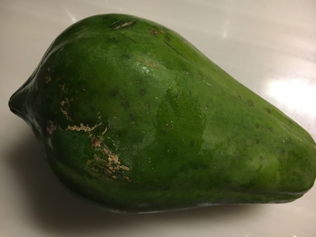 沖縄で買ってきたパパイヤ使ってしりしりを作ろうと思ったのですが、パパイヤがもう熟してました。これよく見るとラベルは生パパイヤと書いてあって、いつもの青パパイヤではありませんでした。こんなに外見が青いのに、残念。いつもなら沖縄料理のしりしり作って、タイ料理のソムタムを作るのですが。果物のパパイヤはあまり好きではないんですね。
