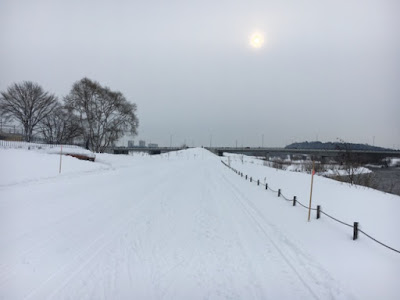 少しだけ、忠別川のクロカンコースを走りました。ここは時間があればじっくり走りたいところ。寒くてなかなかホテルから出ことが出来なかったので仕方ないです。雪は適当に柔らかいので砂の海辺を走るようでトレには有効かと。
