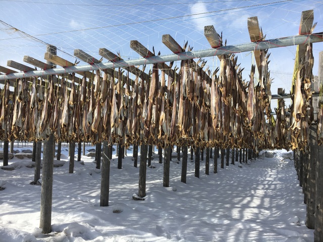 斜里漁港は見事に真っ白で凍っています。船は全部陸の上です。漁港の近くではタラが大量に天日干しされていました。干物のにおいがプンプンします。