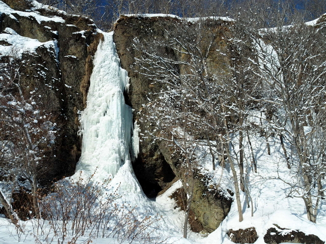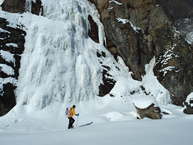 岬の方に向かってスノーシューハイクをすると、次々に滝が見えてきます。やはり全体に滝は小ぶりでつながっていない滝もあります。昨年よりさらに奥の方に進みましたが、1から2本登れそうな滝がありました。ただ、問題は上に雪庇があること、またアンカーとなる木がいい位置にないことなどで今回はそこは登らないことにしました。
