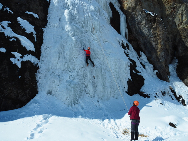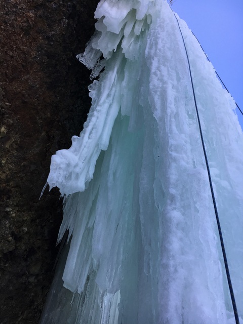 初日は、クジラの滝とその隣の滝を何本か登りました。滝は全体に去年より小ぶりですね。わたしの一本目(クジラの隣)、最低でした。今シーズン、本数は3本登っただけでまだアイスの感覚を取り戻していなかったようで、いきなり角度のきついルートを登ってすぐにパンプしちゃいました、セカンドでボロボロ、だめですね、リードでなくて良かった。この後はやっと感覚取り戻したようで例年どおり登れるようになって、アイスを楽しめるようにはなり、ホッとしたのでした。