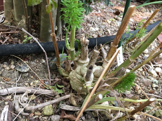ダイコンの葉の勢いが出てきました。大衆あたり一二本引き抜きます。すっかり枯れてしまったフェンネルの芽が出てきました。これで何年目でしょうか。